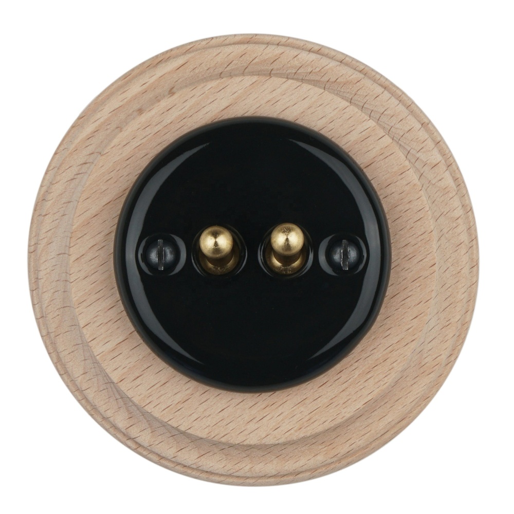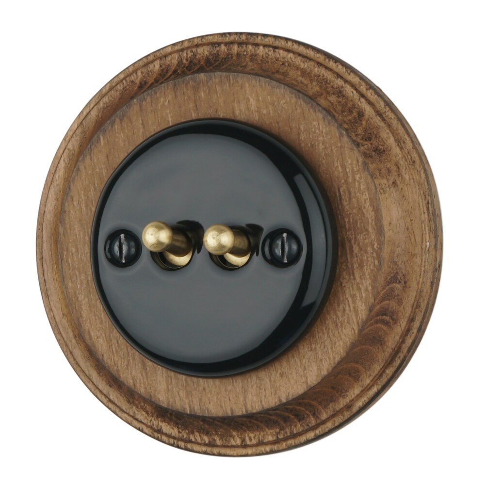Fnd dubbele wisselschakelaar, porselein, zwart, schroefklem, type 2, 10A, 250V, IP20.